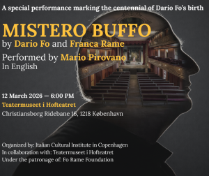I anledning af 100året for Dario Fos fødsel er Det Italienske Kulturinstitut og Teatermuseet i Hofteatret gået sammen for at præsentere en forestilling for et inviteret publikum torsdag 12. marts med Fos elev Mario Pirovano på Hofteatrets nyrestaurerede scene.